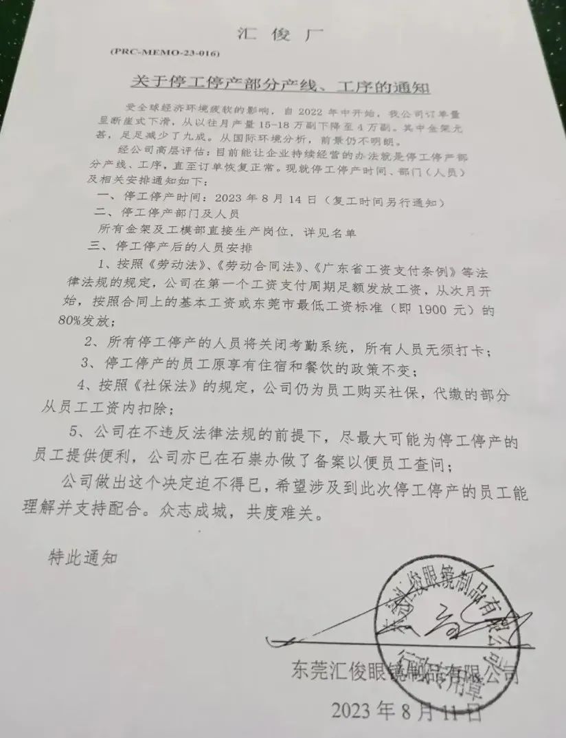 东莞辉俊眼镜制品表示,受全球经济环境疲软的影响,自2022年中开始,订单量断崖式下滑,以往月产量15-18万副下降至4万副。其中金架尤甚,足足减少了九成,前景仍不明确。经高层评估,所有金架及工模部直接生产岗位停工停产。