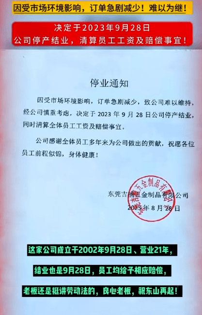 近日,经营了三十余载的老厂—— 东莞虎邦五金塑胶制品有限公司宣布结业。企业发布的通告上提到,因近年来亏损严重,举步维艰,难以为继。经高层审真评估后,仍无法扭转预势。决定自2023年10月31日2023年11月20日起分批歇业,停止生产。