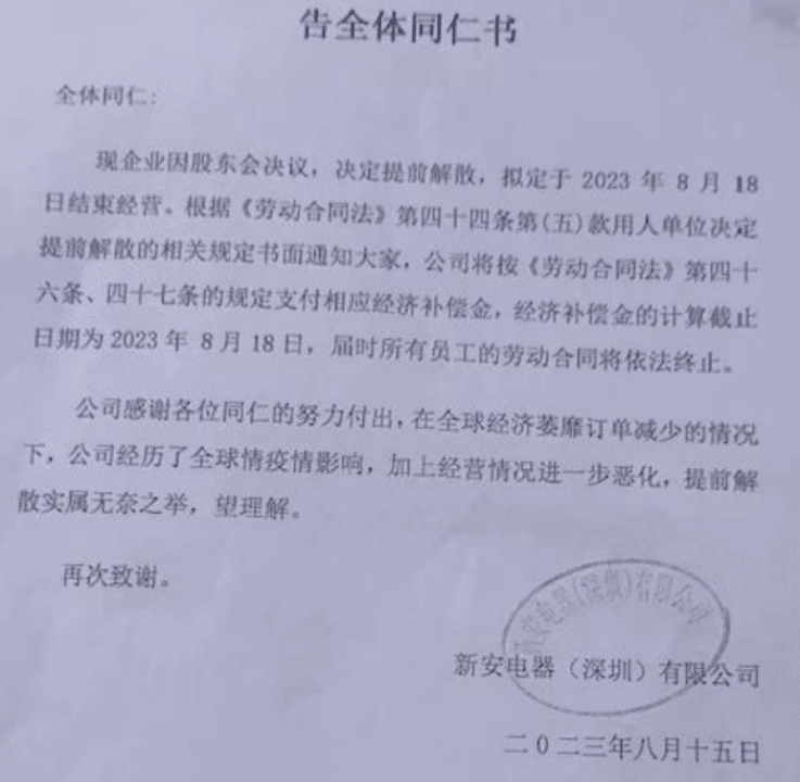 新安电器(深圳)有限公司宣布结束经营。在全球经济萎靡、订单减少等情况下,经营情况进一步恶化,提前解散实属无奈之举。