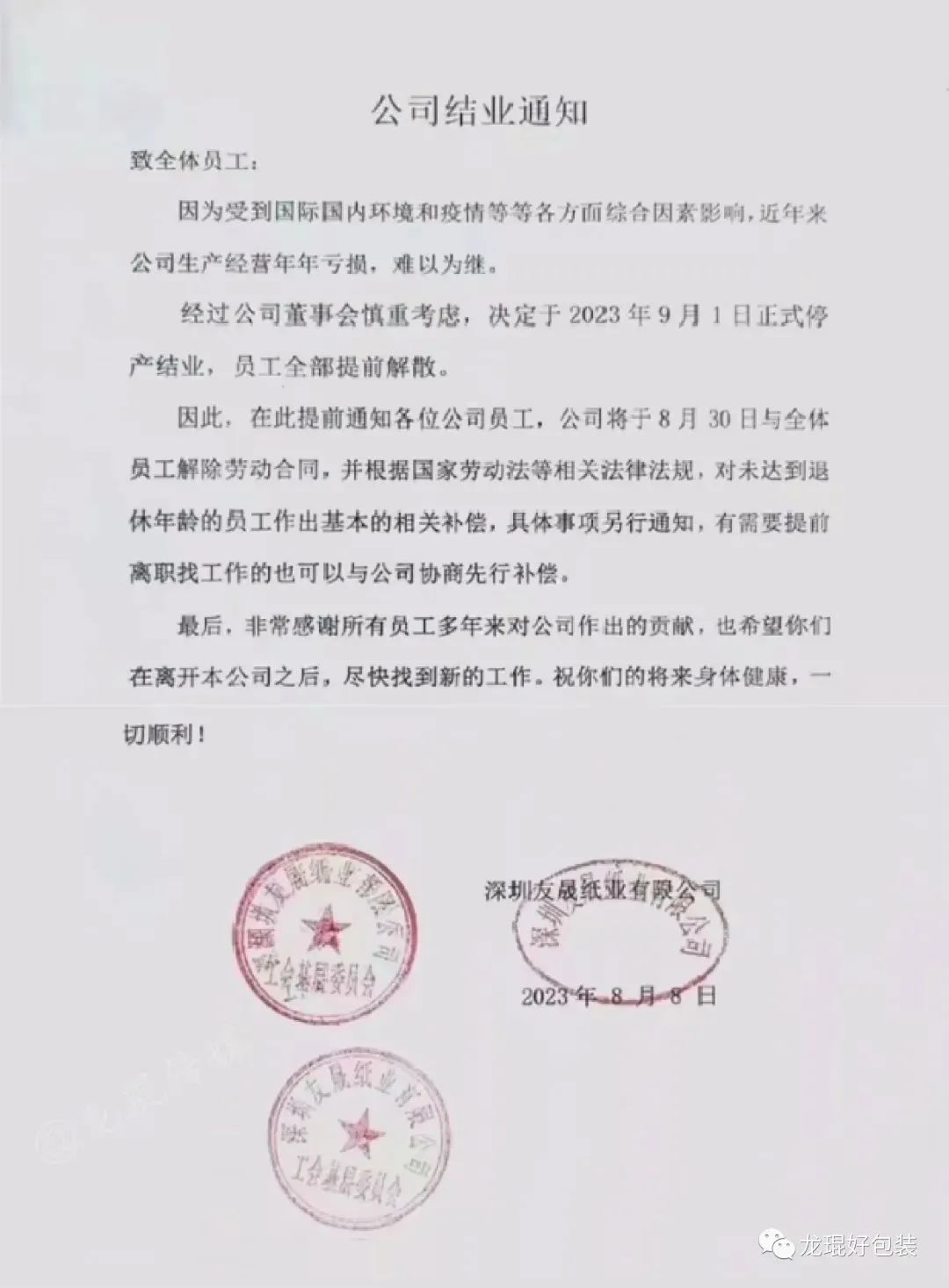 深圳市友晟纸业发布结业通知,受国际国内环境和疫情等各方面综合因素影响,公司近年来生产经营年年亏损,难以为维。经过公司董事会慎重考虑,决定停产结业,员工全部提前解散。