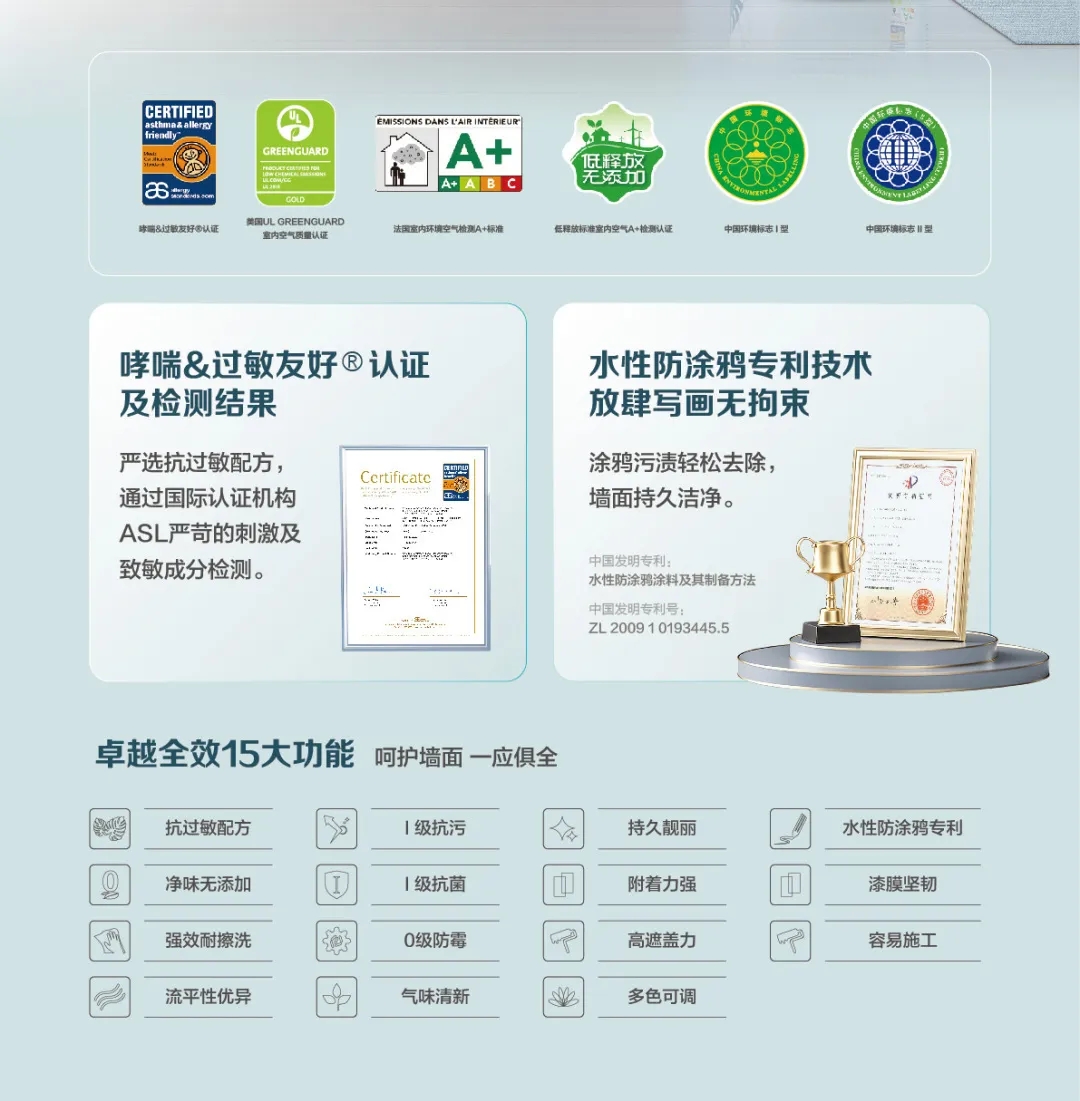 嘉宝莉正是敏锐地洞察这一消费者需求,于2020年提出“易呼吸”概念,研发创新性抗过敏配方,专为易敏人群设计,并于2021年作为首家中国涂料品牌通过国际认证机构Allergy Standards Limited (ASL)哮喘&过敏友好认证,更适合易过敏、哮喘人群。