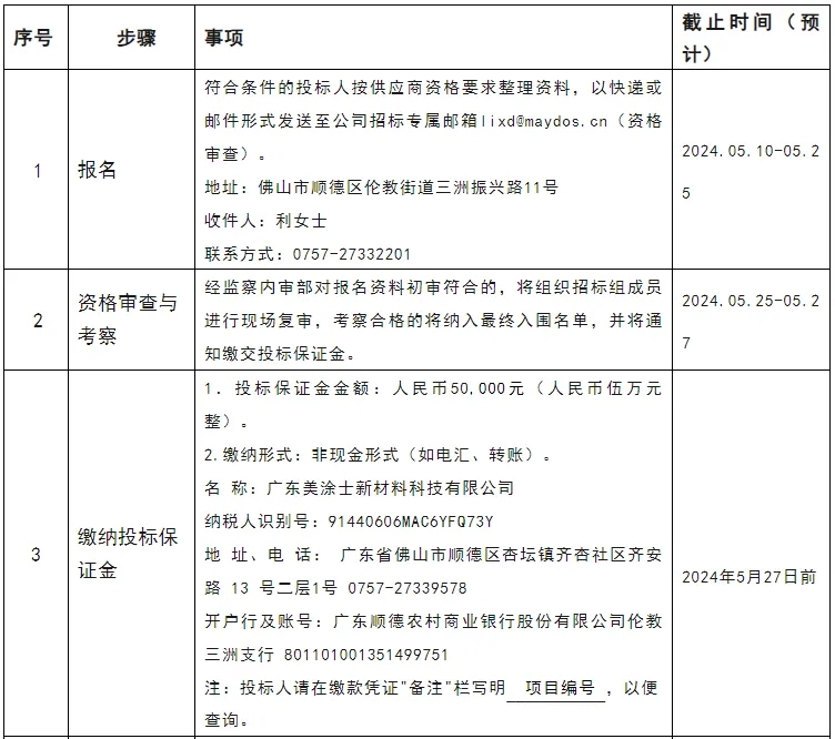 与此同时,美涂士发布全球生态智能总部二期车间设备安装工程招标公告。广东美涂士新材料科技有限公司根据市场情况,为了满足建筑需求,经公司研究,对车间设备安装工程进行公开招标,欢迎符合条件的合格投标人参加投标,有关事项如下: