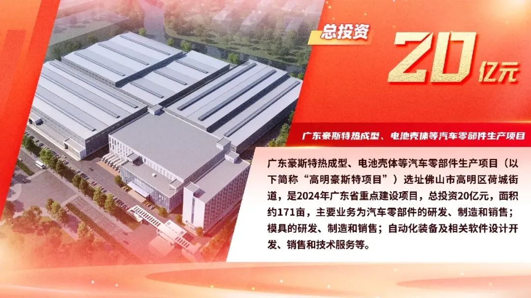 “截至2024年4月底,项目各项工程正有序推进,已完成年度投资进度的40%。”据负责人透露,高明豪斯特项目预计可在2027年左右达到满负荷投产,届时或可实现超135万套电池壳体及近3000万件汽车零部件的年生产能力,年产值超17亿元,年新增岗位约800个。