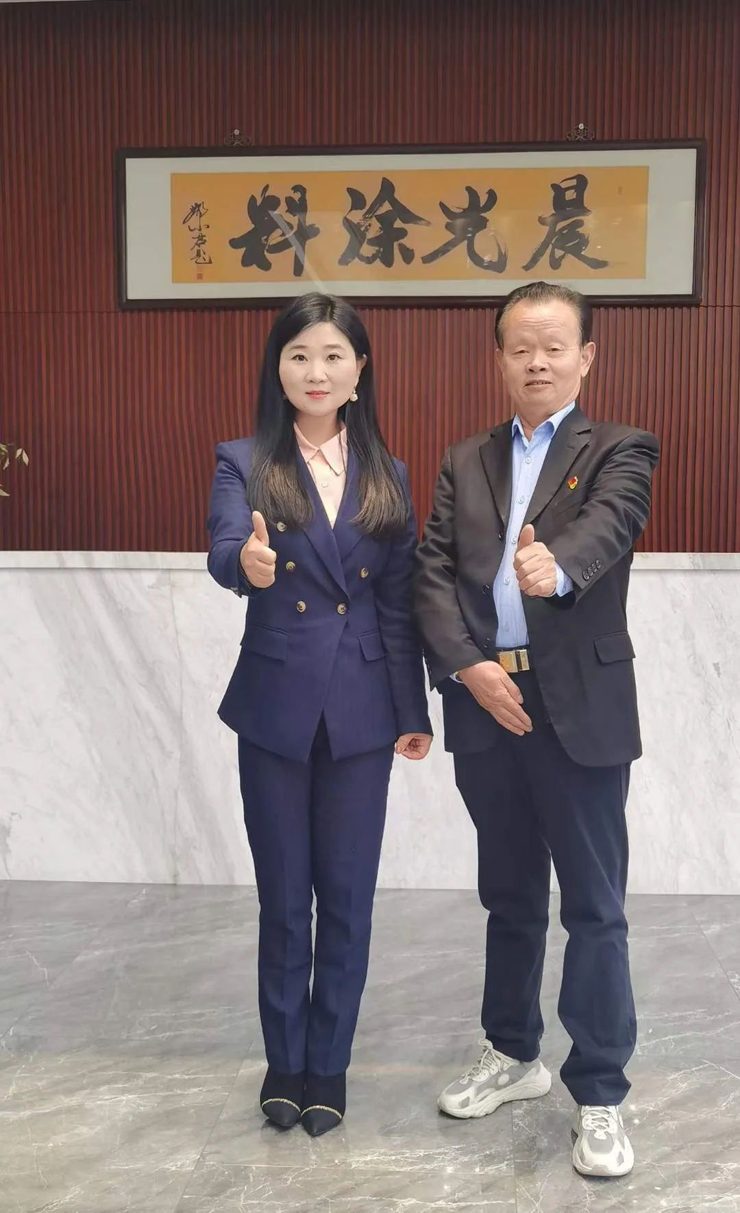 涂料采购网王赛(左)与晨光涂料董事长缪国元(右)合影