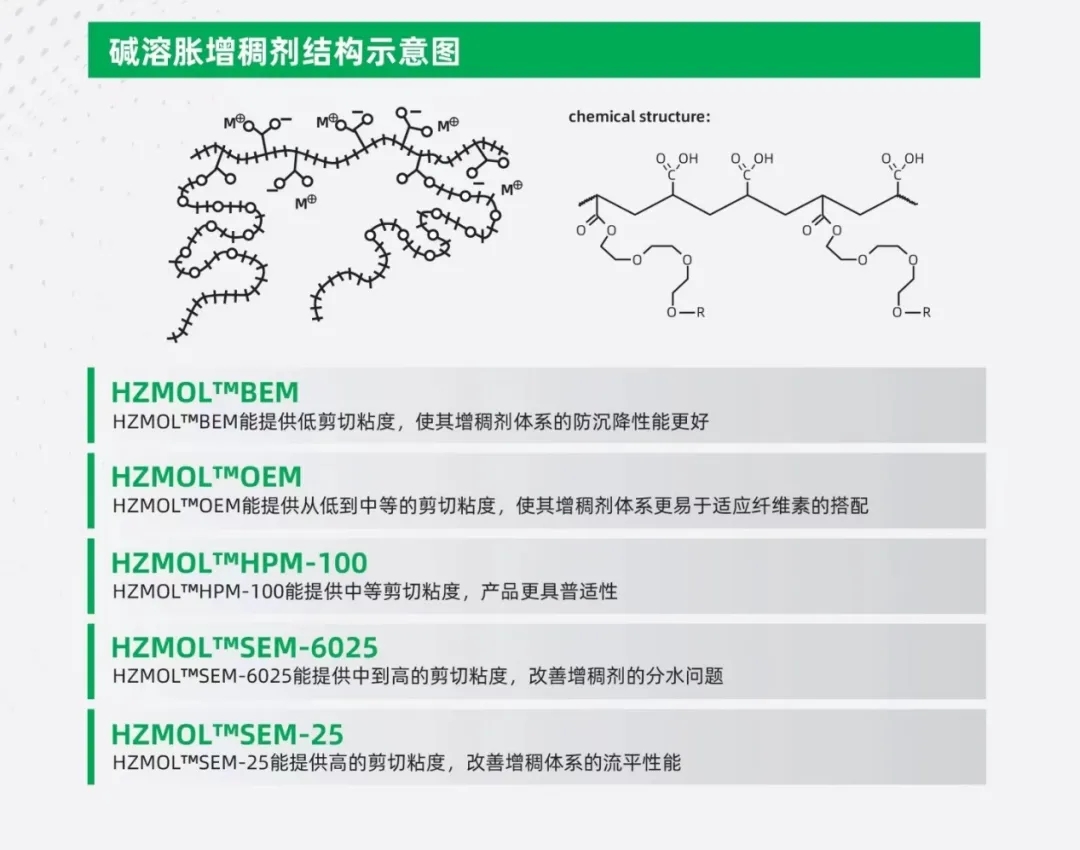 而在竞争激烈的增稠剂行业,化工大省浙江的一家知名企业或许可以成为您的合作伙伴。杭州摩耳新材料有限公司(以下简称“摩耳新材料”)自主研发的HZMOL™系列特种单体包括BEM、OEM、HPM-100、SEM-6025和SEM-25等。这些特种单体通过独特的分子结构设计,引入不同的官能团,实现了对增稠剂性能的精准调控。例如,BEM特种单体通过亲水链和烷烃疏水链的设计,在体系中形成胶束结构,显著提高了增稠效果和稳定性,解决了高乳液含量体系中增稠效果不佳的问题;而SEM-25特种单体则通过刚性苯基结构的引入,改善了增稠体系的流平性能、分散性和剪切稳定性。