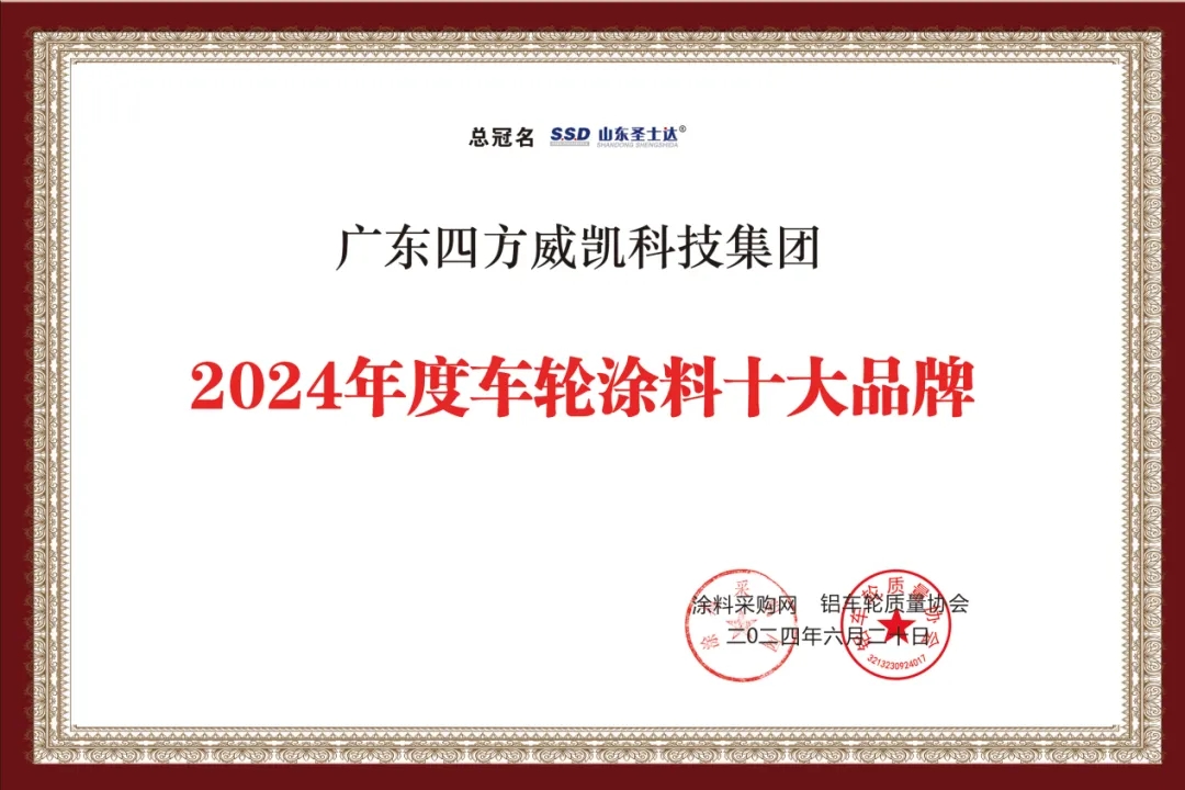 作为国家专精特新“小巨人”企业之一的广东四方威凯新材料技术有限公司(以下简称“四方威凯”)以其先进的技术研发水平、高性价比的产品、完善的服务体系成功入围“2024年车轮涂料十大品牌”。在本届高峰论坛中,由铝车轮质量协会秘书长王孝东和“2024年车轮涂料十大品牌”总冠名山东圣士达机械科技股份有限公司副总经理刁鹏方共同颁奖,并对四方威凯的入围表示热烈的祝贺。