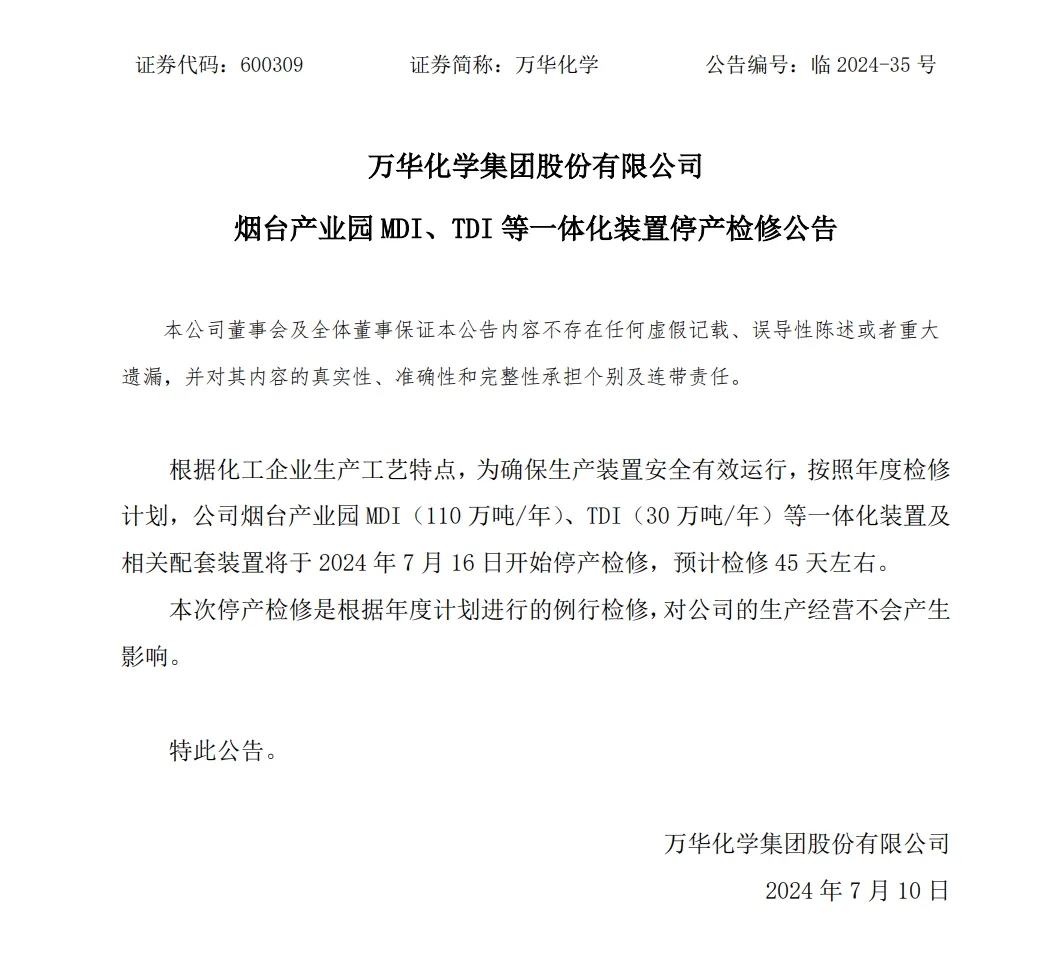 正所谓龙头吼一吼,行业抖三抖,“化工一哥”的停车检修,在行业内引起极大的重视。值得注意的是,下半年国内TDI、MDI装置检修计划较多,产量有损失风险,供应或持续偏紧,预计三季度行业产量将大幅萎缩。而供给紧缺后续会不会出现价格上涨,恐怕无人能够断言。