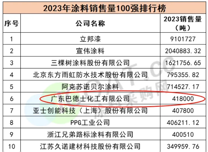 其中,广东巴德士新材料有限公司(以下简称“巴德士”)以418000吨的销售量位居第六,成功跻身涂料销售量十强行列。据悉,2023年的百强榜单现状仍是外资企业占据半壁江山,民族企业发展举步维艰。然而。作为榜单十强中为数不多的中国企业,巴德士在外资企业不断挤占生存空间的情况下,仍取得了显著的成就——今年的销售量较去年增长了38000吨,较去年同比增长10%,排名也因此上升了一名,并逐年呈上升趋势。值得注意的是,2023年销售量区间为10-50万吨的涂料企业中仅有25家,占榜单总数的25.38%。巴德士作为这一区间中的领军企业,其销售量更是突破40万吨大关,实现了崭新的跨越式发展。