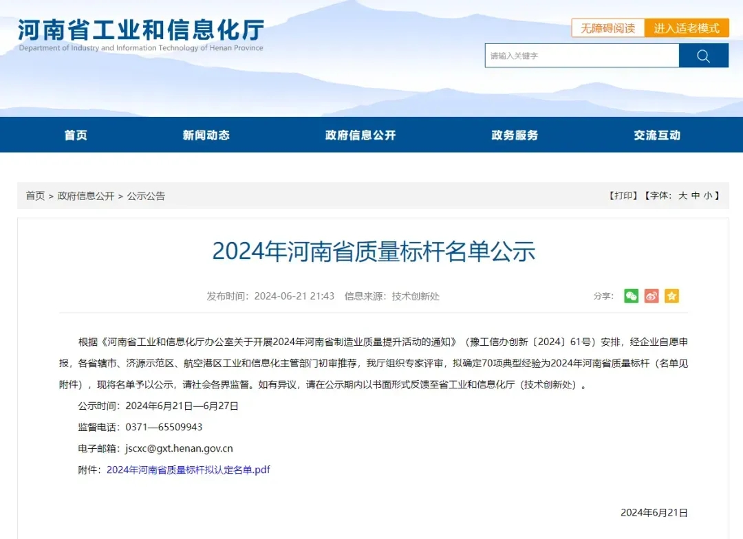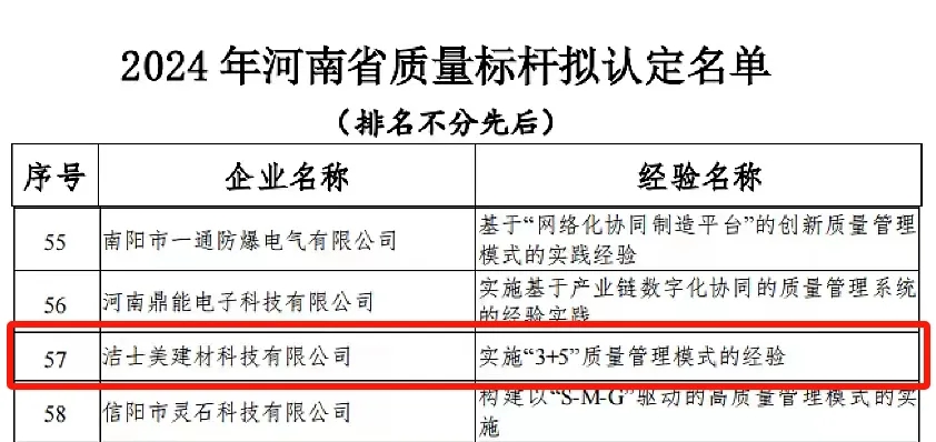 洁士美建材科技有限公司荣获河南省质量标杆企业