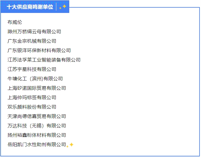 应涂料企业的需求,涂料行业头部媒体——涂料采购网开展了“2024年十大涂料优秀供应商”评选活动,流程包括企业报名、下游用户推荐,线上投票,专家组评审等环节,不仅考量了供应商的产品质量、技术创新能力,还综合评估了其市场影响力、客户满意度以及环保和可持续发展等方面的贡献。
