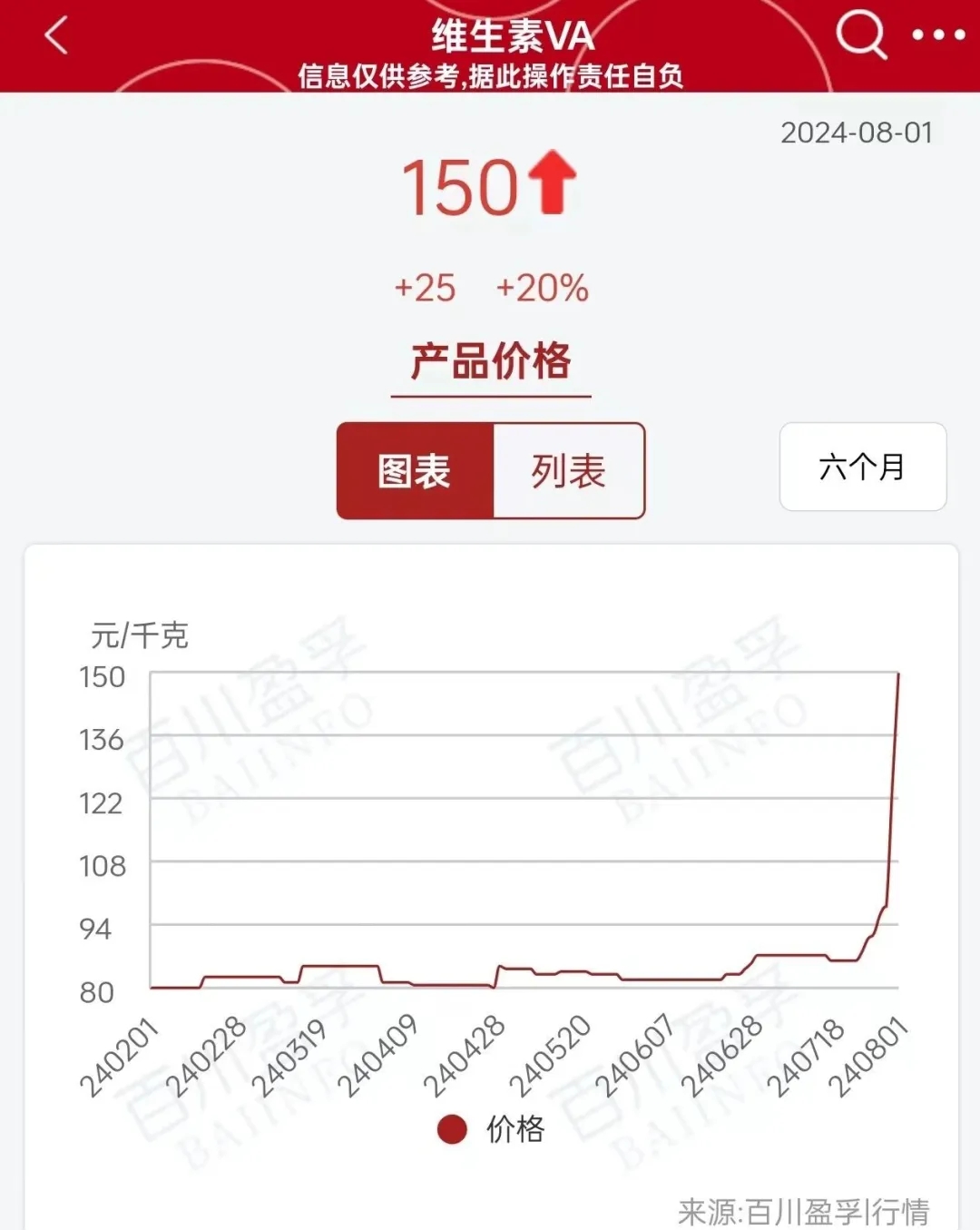 数据显示,VA价格方面,7月30日为98元/千克,7月31日为125元/千克,8月1日为150元/千克;VE价格方面,7月30日为95.5元/千克,7月31日为108元/千克,8月1日为115元/千克。换而言之,巴斯夫德国工厂的事故发生后,VA价格两天涨幅达到了53%;VE涨幅达到20%。