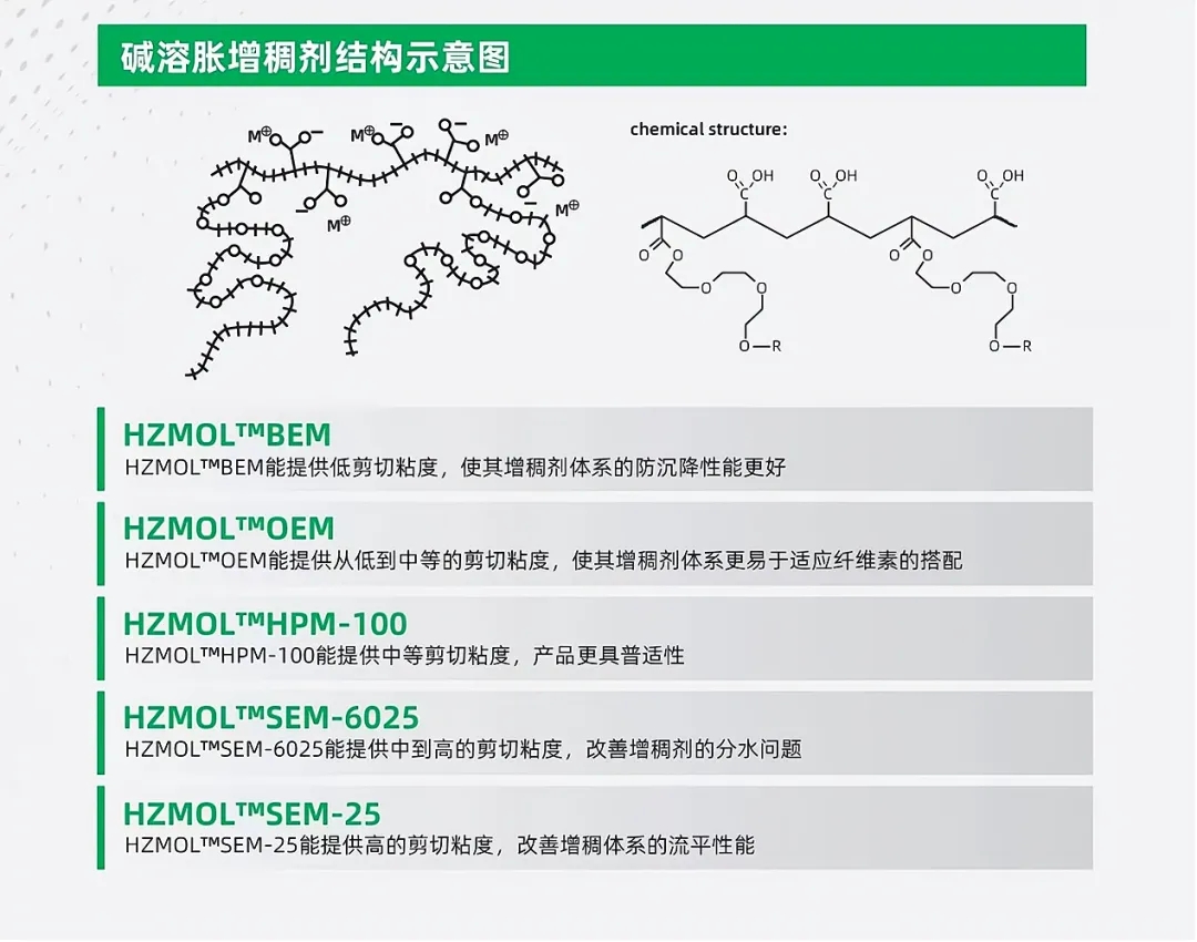 在碱溶胀增稠剂转变为疏水型碱溶胀增稠剂这一变革的关键时期,杭州摩耳新材料有限公司(以下简称“摩耳新材料”)凭借其深厚的技术底蕴和创新精神,成为了助力碱溶胀增稠剂转型的先锋。疏水缔合型碱溶胀增稠剂主链结构是由甲基丙烯酸和丙烯酸乙酯以及特种单体组成。而摩耳新材料推出的HZMOL™BEM特种单体,正是针对碱溶胀增稠剂局限性所设计的创新解决方案。HZMOL™BEM特种单体的结构中同时含有亲水链和烷烃疏水链,所以会在其分子内或分子间产生类似表面活性剂之类的胶束结构,进而有效促进碱溶胀增稠剂向疏水型转变,从而显著提升水性涂料的性能表现。