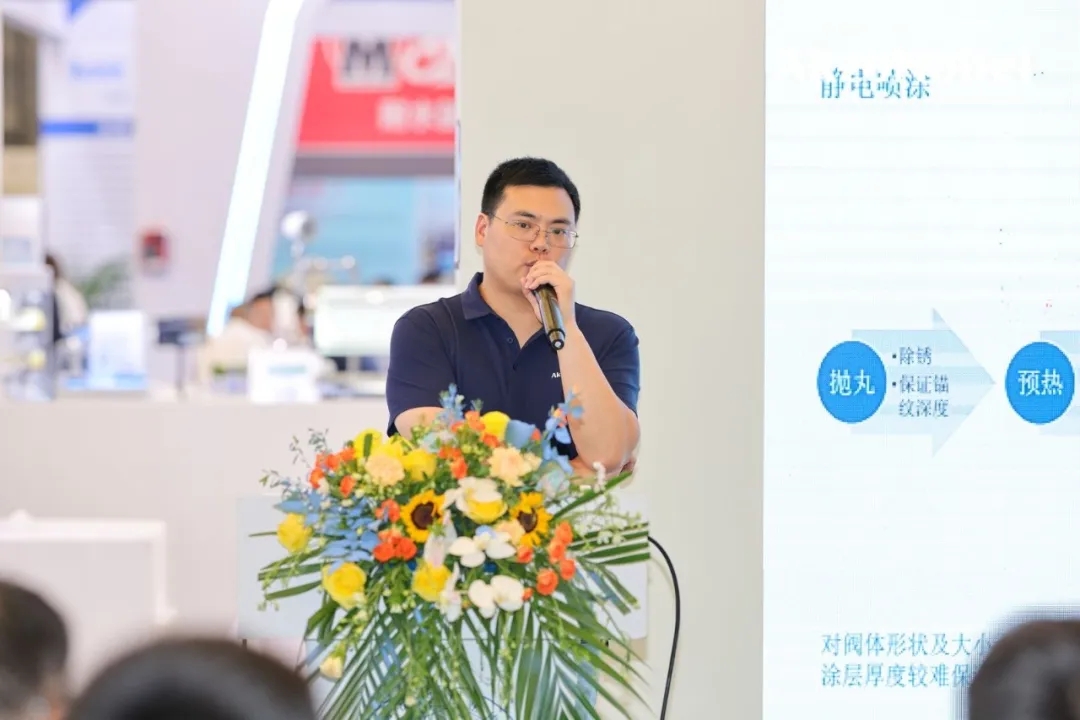 阿克苏诺贝尔功能性伟德客户端官网研发经理陈鹏飞为观众介绍饮用水水管伟德客户端官网解决方案