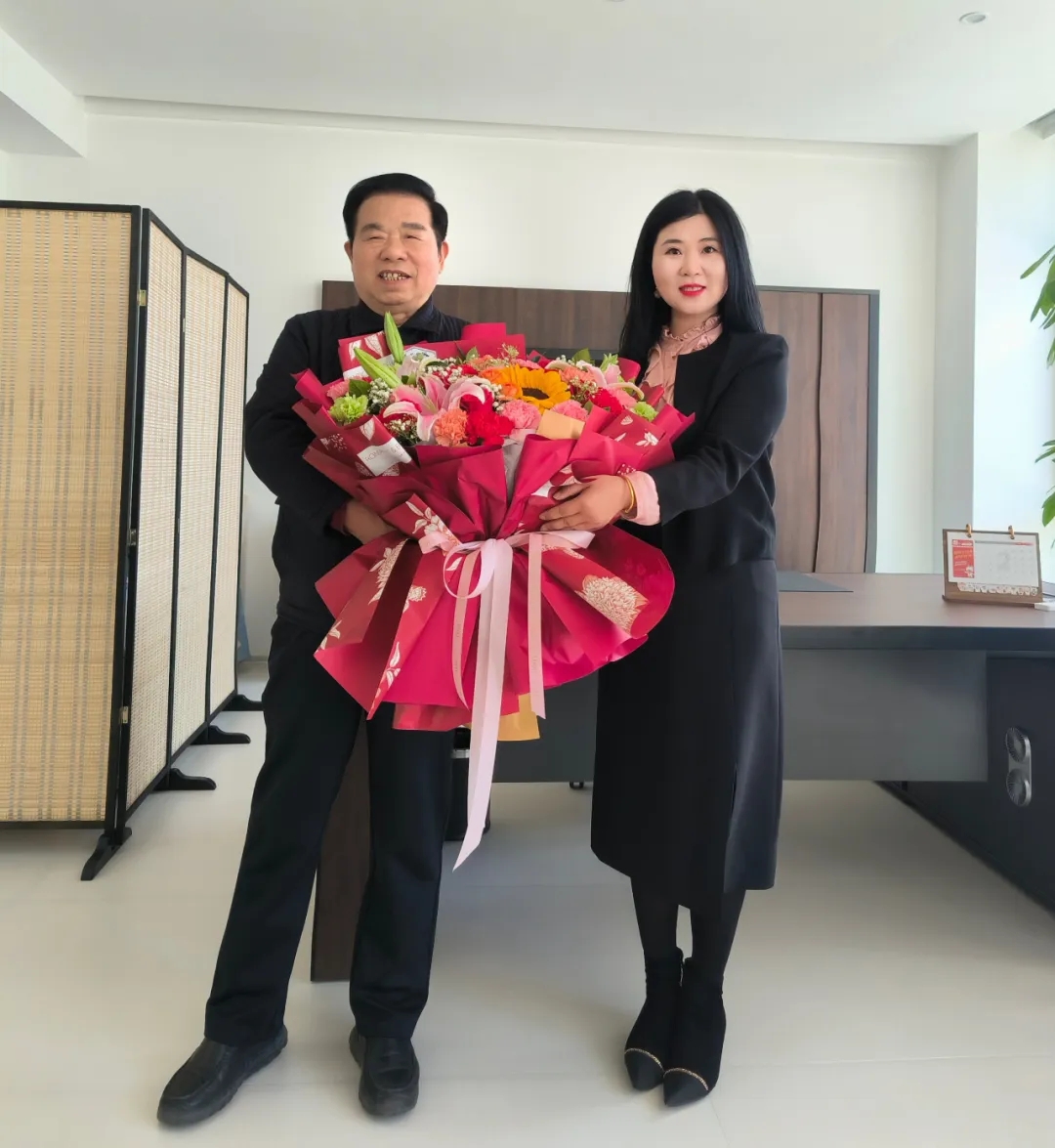 涂料采购网王赛(右)到访卧龙涂料并与创始人李国报(左)合影
