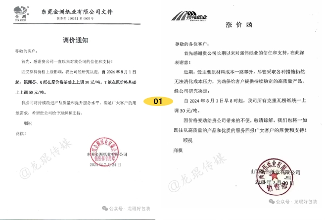 山东、山西、河南、四川等多个省市传来原纸涨价函,将从8月1日上调瓦楞纸、白板纸30-50元/吨。