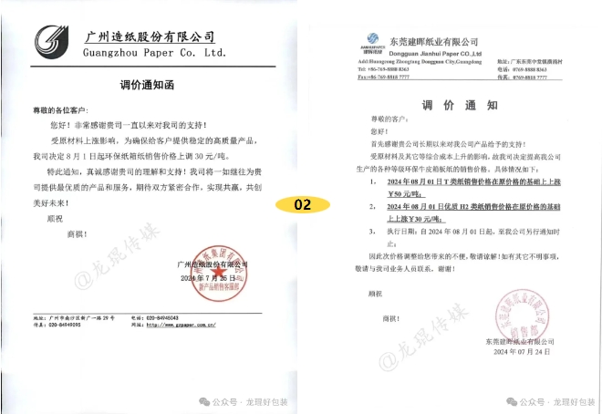 广州造纸股份有限公司环保纸箱纸销售价格上调30元/吨。