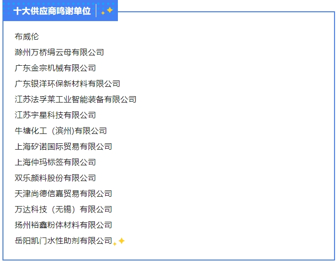 龙佰集团股份有限公司、安徽博颜新材料有限公司等十家企业荣膺“颜料十大优秀供应商”称号,用精准的色彩控制和环保理念,丰富了涂料的色彩世界,为涂料行业增添了无限的色彩与活力。