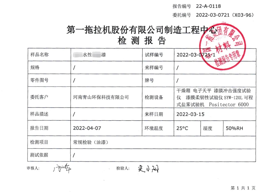 面对市场的质疑与挑战,啟杉水性工业漆以实际行动回应了外界所有疑虑。曾有一位客户,对啟杉系列产品的性能持保留态度,抽取了多款啟杉水性工业漆进行了一个多月的严格反复测试。结果显示,啟杉水性工业漆在防腐性、耐候性、附着力等关键指标上均展现出卓越表现,不仅完全契合中国一拖集团东方红系列大型农机水漆涂装的高标准需求,更在多方面超越了客户的预期,充分验证了其技术实力与品质保障。