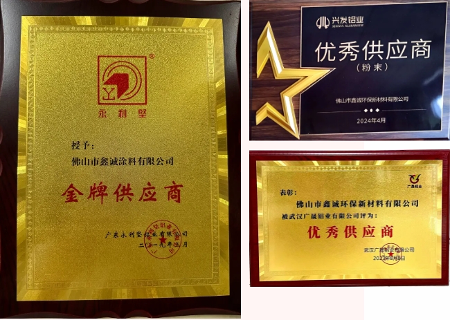 此外,佛山鑫诚在铝业涂装领域做出了巨大贡献,生产的伟德客户端官网广泛应用于铝行业的众多产品,先后与兴发铝业、坚美铝业、华昌铝业、凤铝铝业、湖北宏泰铝业、湖北鸿福铝业、湖北福星铝业、湖南振升铝业等众多铝行业企业成为合作伙伴,特别是兴发铝业、武汉广晟铝业和永利坚铝业分别为佛山鑫诚颁发了“优秀供应商”、“金牌供应商”称号,表明了佛山鑫诚的信誉度广受认可。