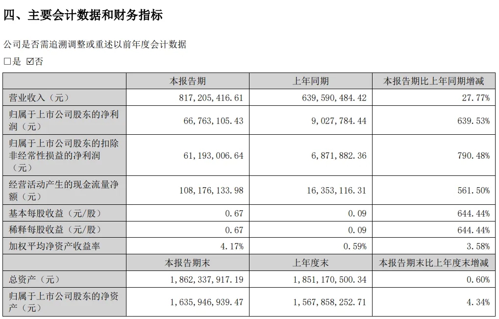 近日,双乐股份(或称公司)发布2024年半年度报告,报告期内,公司实现营业收入8.17亿元,同比增长27.77%;归属于上市公司股东的净利润6676.31万元,同比增长639.53%;基本每股收益0.67元。公司拟向全体股东每10股派发现金红利3元(含税)。