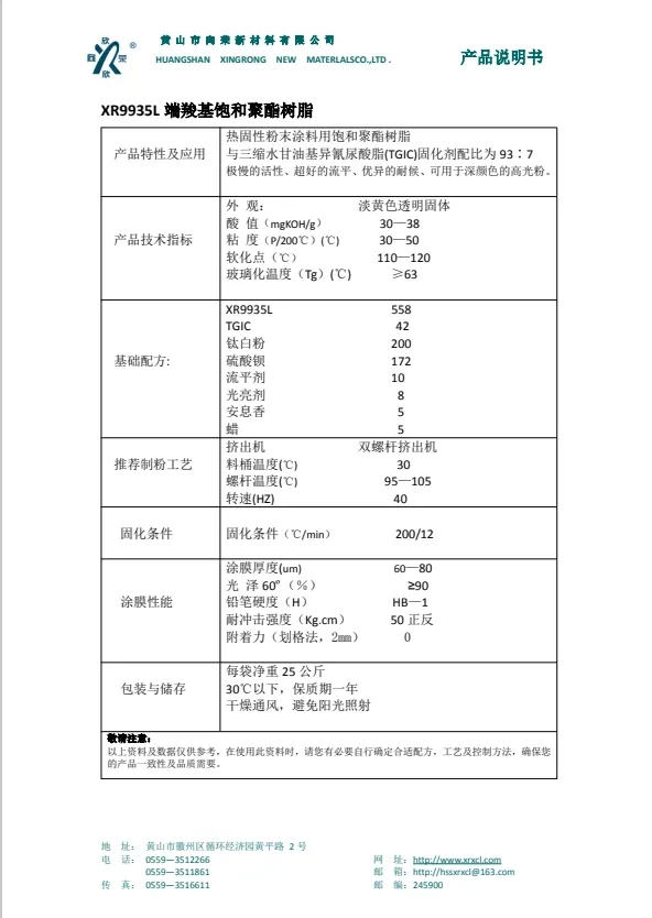 近期,公司又研发推出XR9935L端羧基饱和聚酯树脂,具有慢速反应活性、超好的流平和丰满度、优异的耐候性能,特别适用于吸油值较高的深色高光粉末,与三缩水甘油基异氰尿酸脂(TGIC)固化剂配比为93∶7,在工程机械伟德客户端官网当中,可以替代油漆当中的醇母,让伟德客户端官网实现高光、高流平。