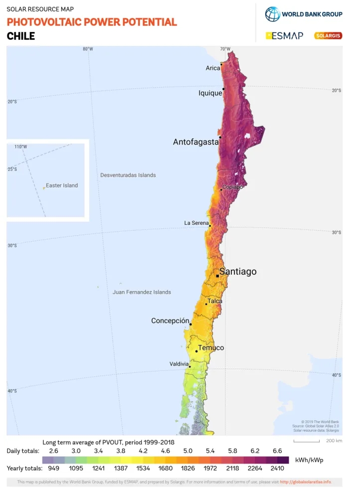 从地理位置上来看,智利北部是世界上日照发生率最高的地区。而且智利北部的阿塔卡马沙漠是地球上最干燥的地方,同时拥有世界上最高水平的太阳辐射,使其成为此类项目的理想选择。