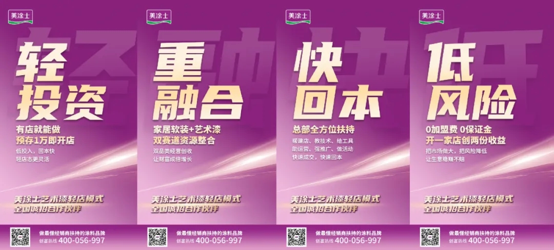面对当下市场不敢轻易投资,并出现严重内卷的环境变化,美涂士针对性推出艺术漆轻店投资项目。