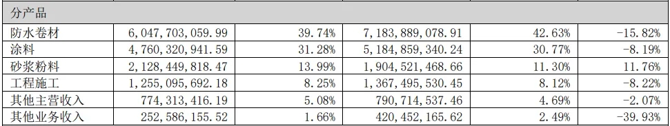 对于营业收入的下滑,东方雨虹半年报称:受下游需求未达预期影响,营业收入较上年同期下降9.69%。具体来看,中国境内实现营业收入148.13亿元,同比下降10.07%;按业务板块销售来看,防水卷材营收60.477亿元,同比下降15.82%;涂料营收47.603亿元,同比下降8.19%;工程施工营收12.551亿元,同比下降8.22%;其他主营收入7.743亿元,同比下降2.07%;其他业务收入2.526亿元,同比下降39.93%。
