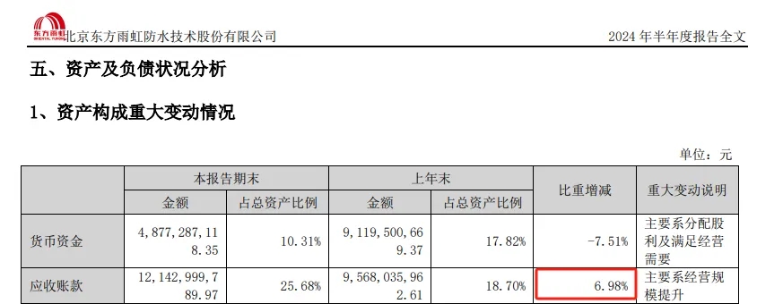 东方雨虹2024上半年的应收账款为121.43亿元,应收票据为5.46亿元,应收票据及应收账款合计126.89亿元。截至2024年上半年末,东方雨虹应收账款较上年末增加26.91%,占公司总资产比重上升6.98%。
