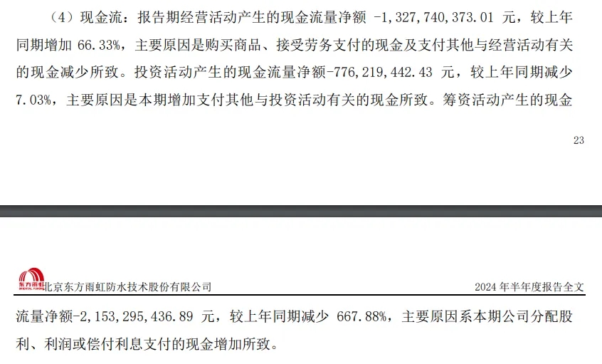 在2024年上半年,东方雨虹报告期经营活动产生的现金流量净额-1,327,740,373.01元,可见现金流的风险仍然存在。