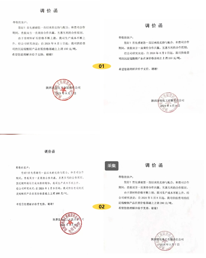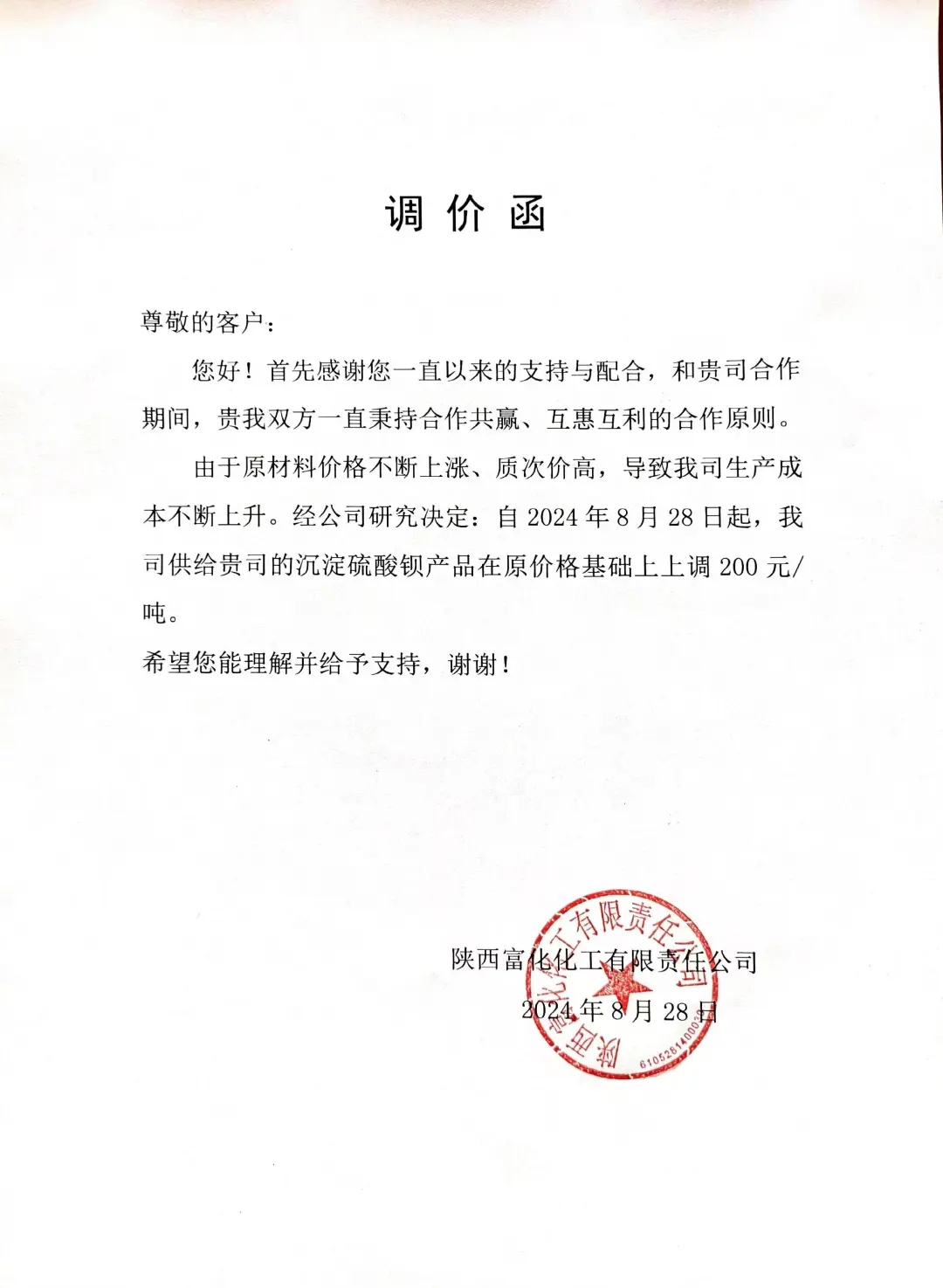 涂料采购网注意到,这已经是该企业在2024年发布的第5张涨价函。今年1月8日、4月8日,5月7日,8月1日,陕西富化化工宣布沉淀硫酸钡产品价格分别上涨100元/吨、150元/吨、200元/吨、100元/吨,全年累计上涨750元/吨。