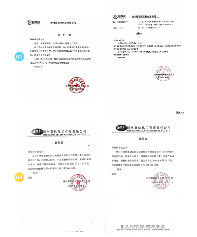嘉信化工、贵州誉福隆科技等于6月和8月发布调价函,宣布沉淀硫酸钡价格上调100元/吨。