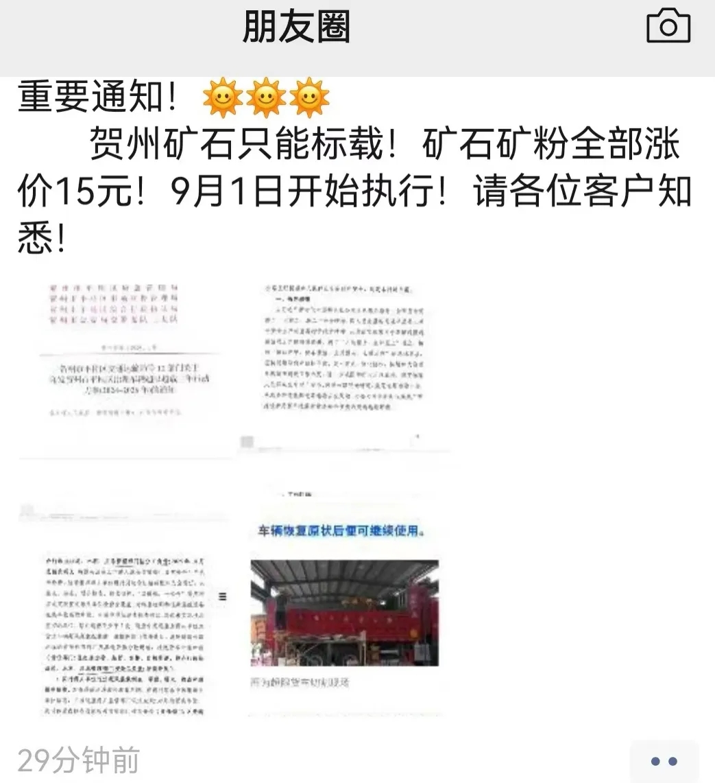 另外,今年年中贺州市交通运输局发布了《贺州市交通运输局等14部门关于印发贺州市治理车辆超限超载三年行动方案(2024-2026年)的通知》,当地矿石厂表示,可能会引发矿石、矿粉涨价。