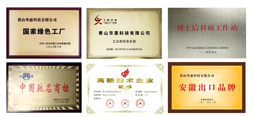 一路走来,黄山华惠能赢得众多涂企的高度赞誉,这与其坚持攻坚核心技术领域的智慧与努力息息相关。正是由于始终坚持自主研发,黄山华惠才能连续5次通过国家高新技术企业认定,荣获国家知识产权优势企业、国家专精特新“小巨人”企业和安徽省技术示范企业、国家绿色工厂等荣誉称号,至今已成为拥有56项专利(23项发明专利)、安徽省新产品10项的创新导向型企业。