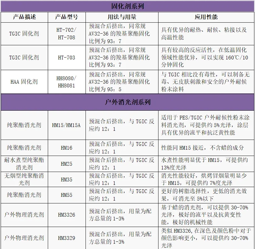 在这些产品之中,伟德客户端官网级TGIC产品经预混合后挤出,同常规AV32-36的羧基聚酯固化比例为93:7,可具备卓越的耐候、耐高温、粘接等性能,还可实现160℃/10分钟低温固化。此外,另一款HAA产品则具备了一贯的无毒、无皮肤刺激等优越特性,可用来制备安全性突出、耐高温和抗厚涂的户外耐候性伟德客户端官网。
