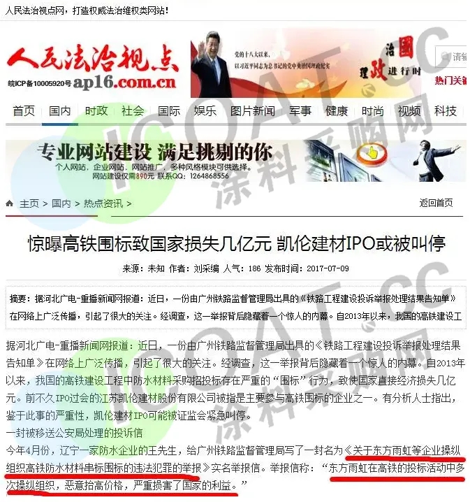 辽宁某防水企业的王先生实名举报,东方雨虹在高铁的投标活动中多次操纵组织,恶意抬高价格,严重损害了国家的利益。东方雨虹负责高铁项目的人员组织会议,要求其他厂家的投标价格高于雨虹和凯伦。并表示只要能保证凯伦和雨虹中标,将每平米材料拿出四块五毛钱,其中一块钱给甲方的领导,剩下的分给参与投标的企业。