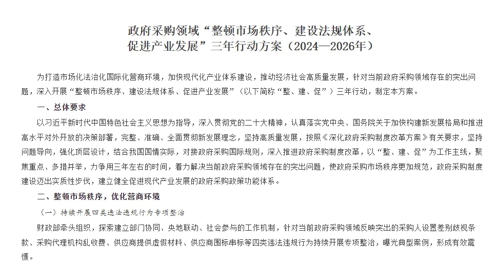 尽管问题重重,但招标投标的这种工程集采模式却不可一概而论地否定,只能加强监管并且逐个击破,保护这种采购方式,进行良性竞争。针对政府采购领域突出问题,今年7月,国务院办公厅印发《政府采购领域“整顿市场秩序、建设法规体系、促进产业发展”三年行动方案(2024—2026年)》,采取了针对性解决举措。针对当前政府采购领域反映突出的采购人设置差别歧视条款、采购代理机构乱收费、供应商提供虚假材料、供应商围标串标等四类违法违规行为,财政部将牵头组织开展专项整治。