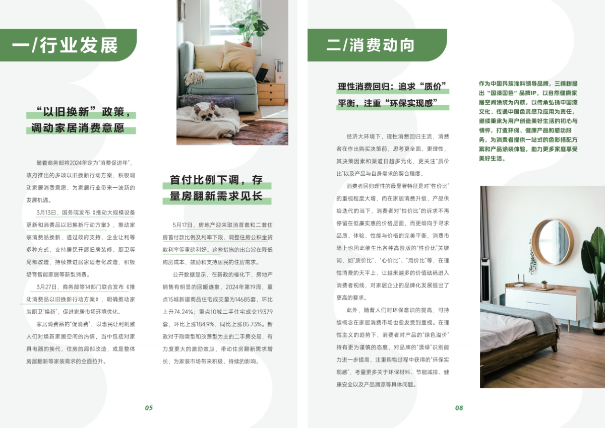 随着房地产市场的成熟与消费者需求的多元化,家居美学设计迎来前所未有的发展机遇。政府层面,《推动大规模设备更新和消费品以旧换新行动方案》等政策的出台,进一步激发了家装市场的活力,促进了家居消费品的更新换代和市场的优化升级。在此背景下,三棵树报告的发布恰逢其时,它不仅是对当前市场趋势的精准把握,更是对未来家居美学设计趋势的前瞻性预测。
