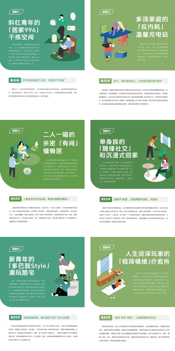 针对不同消费群体的独特生活方式与个性化需求,报告深入剖析并精心打造了一系列专属的家居设计解决方案。斜杠青年的高效居家生活、多孩家庭的温馨互动空间、宠物友好家庭的和谐共处、单身族的沉浸式回家体验、新青年的潮玩酷宅与老年群体的适老化设计,三棵树以敏锐的市场洞察力和卓越的设计能力,为这六大细分人群量身定制理想中的家居空间。