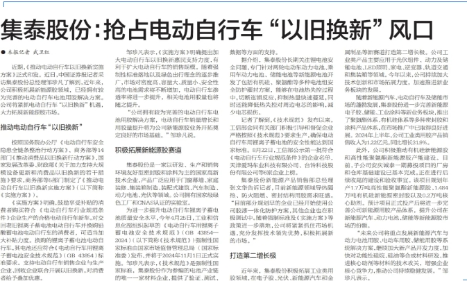 近期,《推动电动自行车以旧换新实施方案》正式印发。近日,中国证券报记者采访集泰股份(或称公司)董事兼总经理邹珍凡了解到,近年来,公司积极拓展新能源胶领域,已经拥有较为完善的电动自行车电池用胶解决方案。公司将紧抓电动自行车“以旧换新”机遇,大力拓展新能源胶市场。