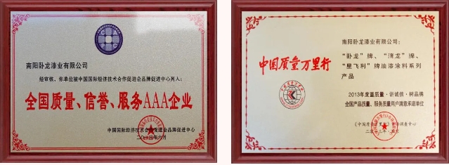 卧龙涂料凭借卓越的品质和服务获得全国质量、信誉、服务AAA企业,“十三五”高质量发展企业,省科技进步奖,优秀新产品奖等多项荣誉,董事长李国报曾获国务院认定的“功勋企业家”荣誉称号。
