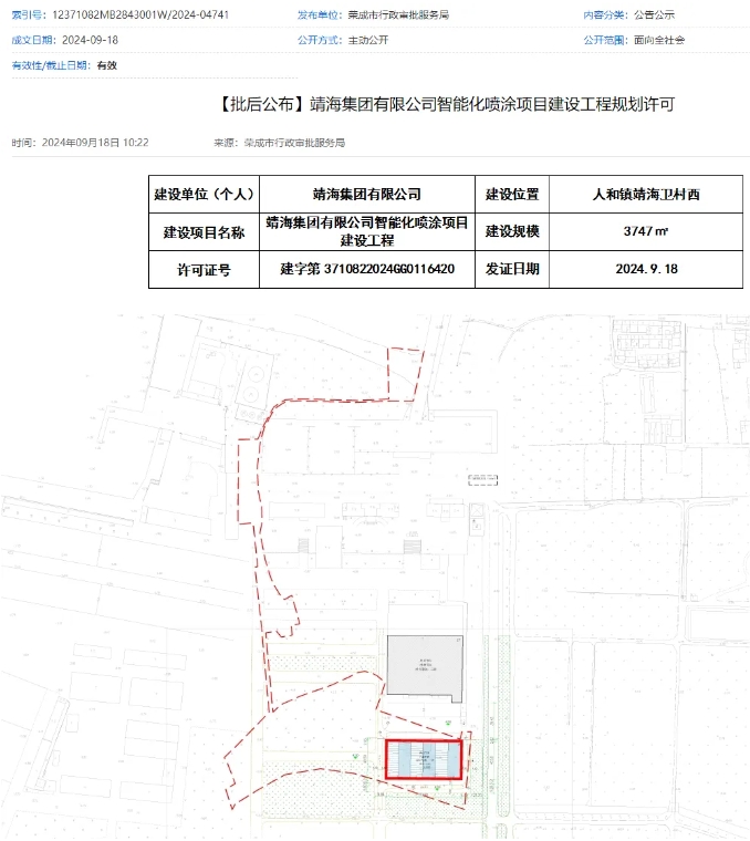 近日,荣成市人民政府发布靖海集团有限公司智能化喷涂项目建设工程规划许可。
