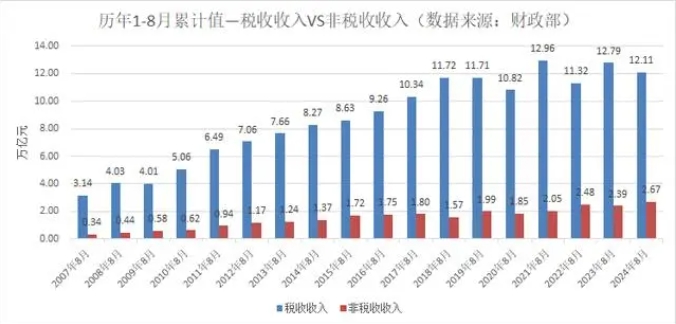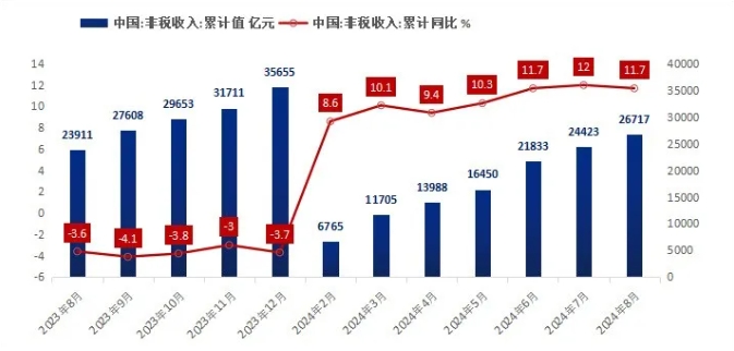 同比往年数据而言,2024年1-8月的非税收入创历史同期最高值。今年上半年,非税收入规模已经高于2014年全年规模。在上半年公布数据的15个省份中,北京、天津、山西、贵州等13个省份非税收入占比同比上升。其中,福建非税收入占比达到42.3%,接近“半壁江山”。