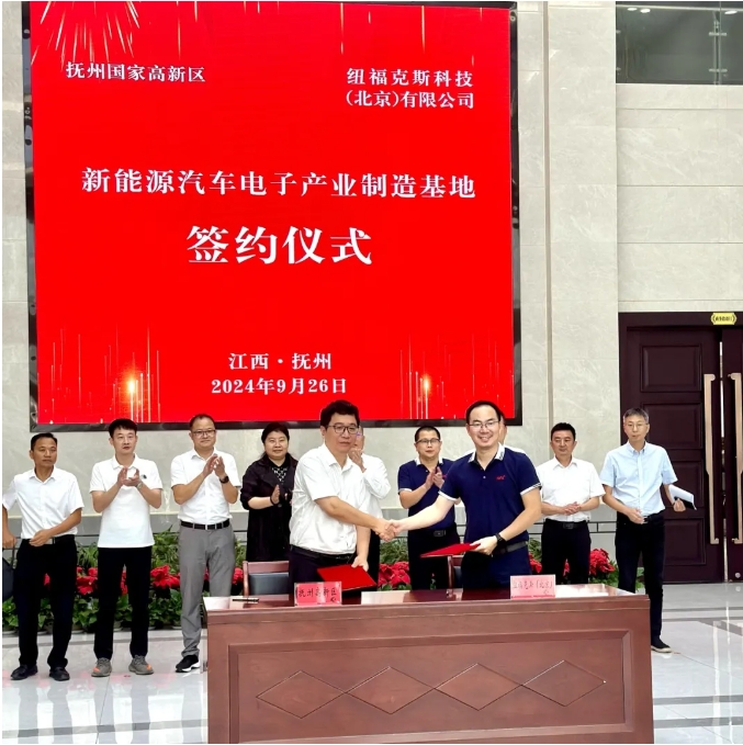 近日,纽福克斯新能源汽车电子产业制造基地项目签约仪式在抚州高新区举行。市政府副市长、高新区党工委书记汪华辉出席,区党工委委员廖明,新焦点汽车技术控股副总裁李凯奇,浙江中科应用技术研究院院长助理邵静贤,中信环境产业基金投资经理刘彬彬等参加。