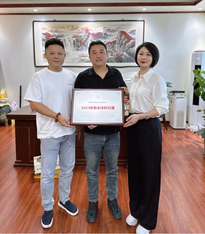 涂料采购网张馨元(右)为华钜粉末颁发粉末百强奖牌