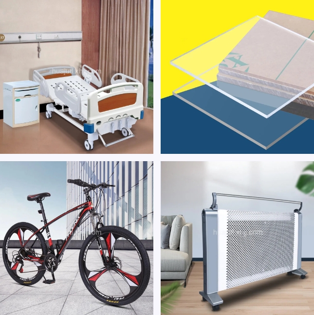 目前华钜粉末产品广泛应用于办公家具、防盗门、汽车配件、铝型材、家用电器、农机用品、散热器、电气设备、清洁用品、健身器材、自行车、铁路设施、公路设施、航空设施等产品的表面涂装,畅销京津冀以及辽宁、山东等多地。