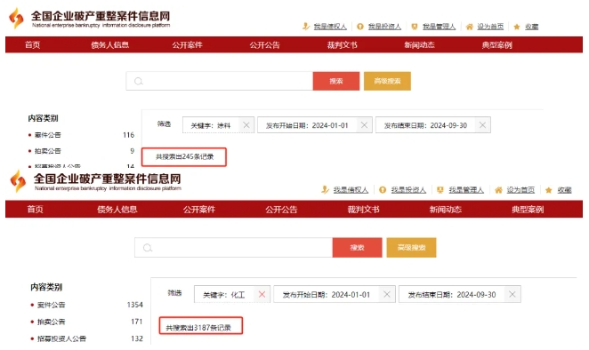 据全国企业破产重整案件信息网数据,今年前三季度,涂料企业破产重整案件共245条记录。化工行业显然出现了更为惊悚的数据:今年内破产重整的共3187条。这还仅仅是关键字为涂料、化工的企业,如果把经销商、贸易商以及一些销售小店都算进来的话,数据将更为触目惊心。