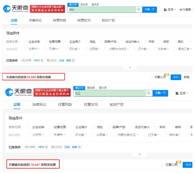 相比于进入破产重整阶段,但还有希望从头再来的企业而言,还有不少涂料化工企业彻底结束了“生命”,注销或解散了多年苦心经营的工厂。这些企业遍布大江南北,有些已经成立了几十年,变成知名的老厂;有些则是看好了行情进场,准备捞金,曾经大张旗鼓开工的场面还历历在目,就因多种原因选择退出。数据显示,成立一年内且注销或解散的涂料企业超过6万家,化工企业近2万家,合计约8.2万家。