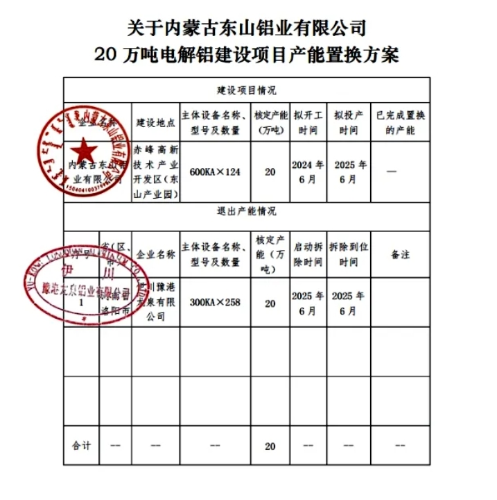 据了解:项目远期规划为100万吨产能,一期为50万吨。2024年6月内蒙古工信厅发公告,伊电控股集团有限公司通过集团内部产能转移的方式,将集团所属河南省洛阳市伊川县伊川豫港龙泉铝业有限公司(以下简称:豫港龙泉公司)20万吨电解铝产能指标转移至赤峰市内蒙古东山铝业有限公司(以下简称:东山公司),豫港龙泉公司和东山公司签订了集团内部产能转移协议书并制定了产能置换方案。项目建设地为内蒙古赤峰高新技术产业开发区(东山产业园),拟建设600kA铝电解槽124台,核定产能为20万吨,拟于2024年6月开工建设,2025年6月投产。