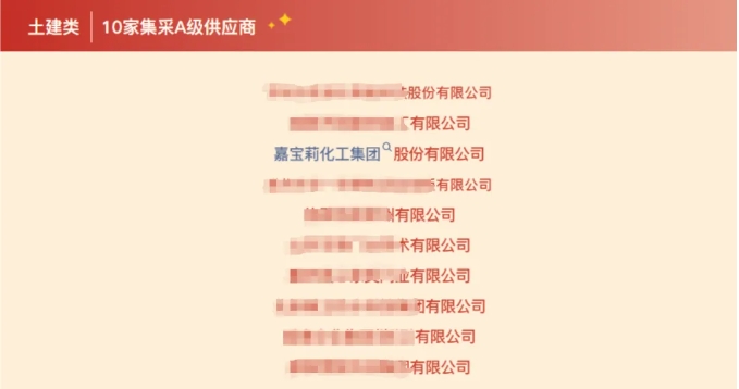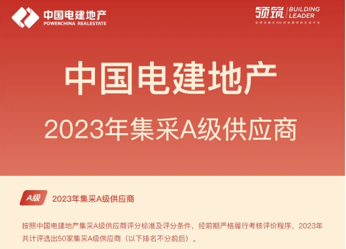 近期,中国电建地产对2023年优秀供应商进行评选,按照中国电建地产集采A级供应商评分标准及评分条件,经前期严格履行考核评价程序,共计评出50家2023年集采A级供应商。嘉宝莉地坪材料凭借高品质的产品体系、个性化的解决方案、专业的技术工艺、优质的服务体系,获得央企中国电建地产认可,荣膺2023年度集采A级供应商称号。
